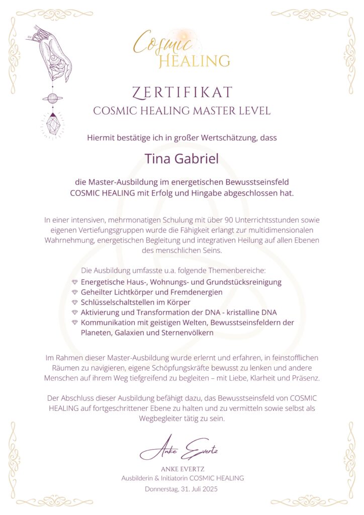 „Tina Gabriel ist eine ganzheitliche und energetische Immobilienmaklerin, die ich in COSMIC HEALING ausgebildet habe.
