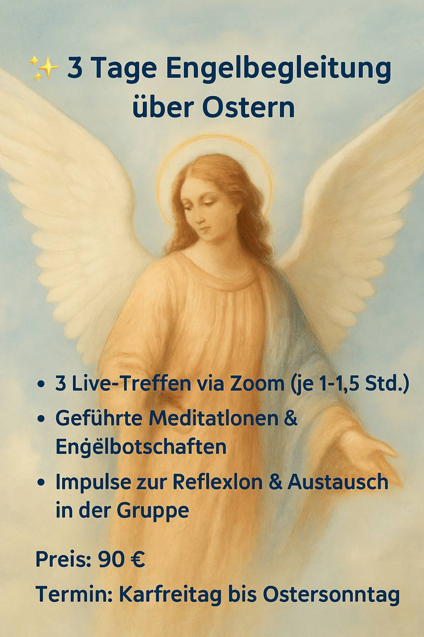 ✨ 3 Tage Engelbegleitung über Ostern ✨ Begib dich auf eine besondere Reise mit der Engelwelt! Über drei Tage hinweg begleiten dich lichtvolle Impulse, geführte Meditationen und Engelbotschaften, um Loslassen, Vertrauen und Neubeginn in dein Leben einzuladen. Was dich erwartet: ✨ 3 Live-Treffen via Zoom (ca 1,5 Std.) ✨ Geführte Meditationen & Engelbotschaften ✨ Impulse […]